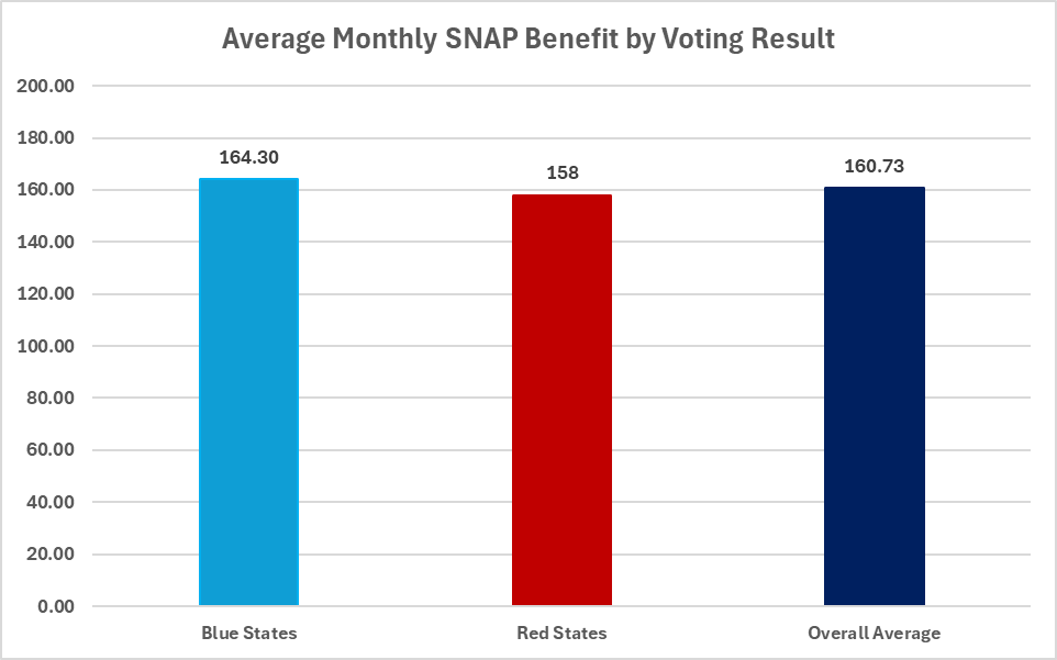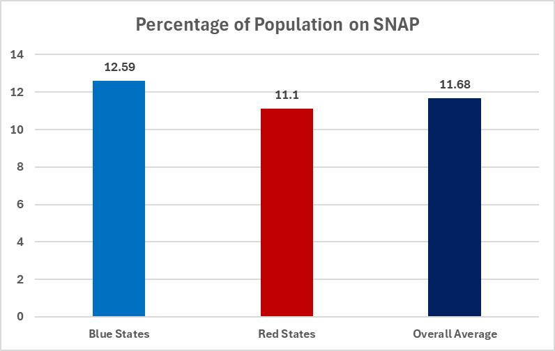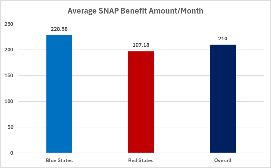 On average, blue states spend about $4 more per person on SNAP than the average, while red states spend $2 less. So yes, blue states do shell out more for SNAP than their red counterparts. Not by a HUGE margin, but there is a difference.