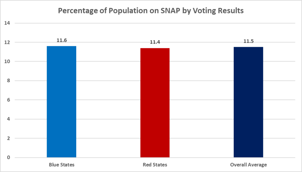 Blue states, on average, do have a higher population on SNAP. By a whopping 0.2%. Considering the overall average, Blue states fall only 0.1% above the line.