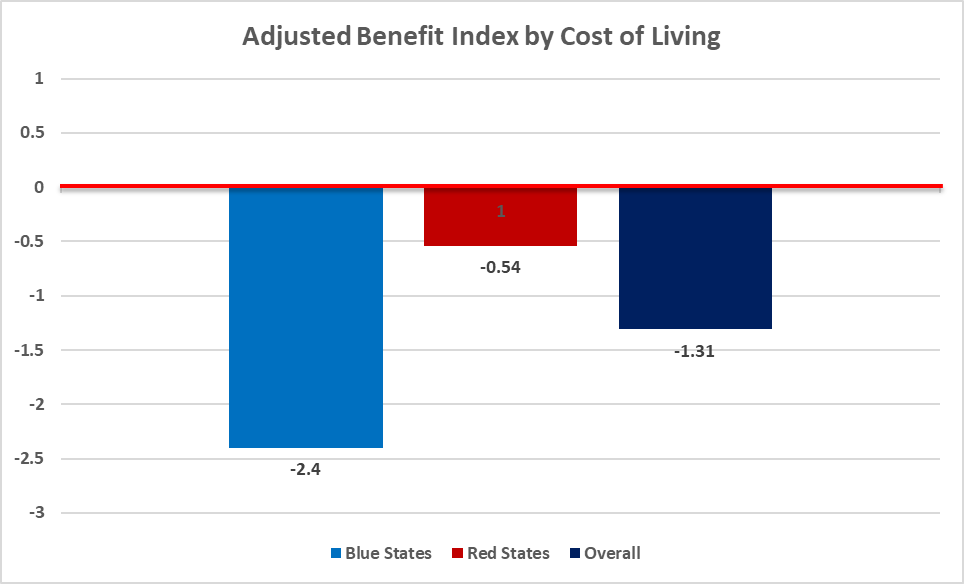 The TL;DR takeaway: While blue states pay more, they pay less than they do in red states based on cost of living. The SNAP buck goes farther in red states, statistically.