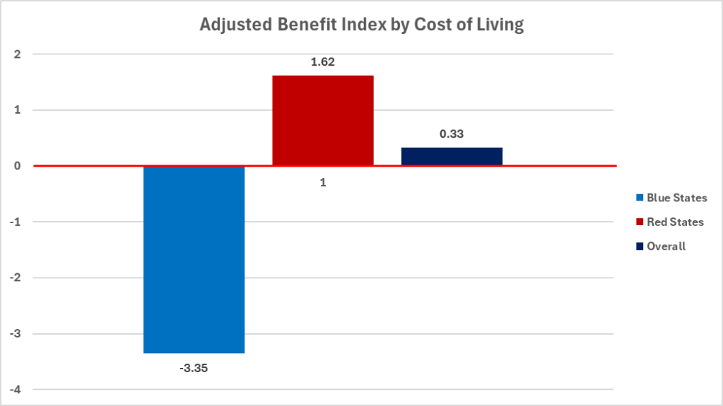 How to interpret this information: The red line is at zero. The value of zero would represent perfect adjustment of the average benefit to meet the state’s Cost of Living index. Anything above that line indicates states getting more than their share of benefits, based on the cost of living there. Anything below the line indicates the opposite: recipients are getting less than their share based on their state’s COL.