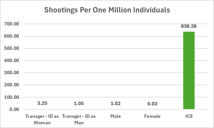 Some future research to look forward to: ICE agent vs. Other officer involved shooting rates, and a deeper dive into the point of transition the transgender shooters were at when they did the unthinkable. Had they been on HRT? Had they undergone gender-affirmed surgery?